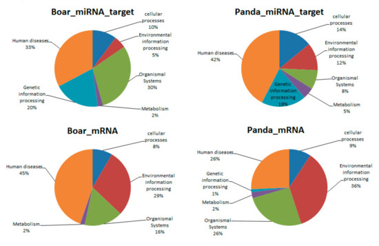 KEGG analysis of the targets of DE miRNAs in boar and giant panda sperm showed that the differences mainly exist in environmental information processing and organismal systems (Figure 4).