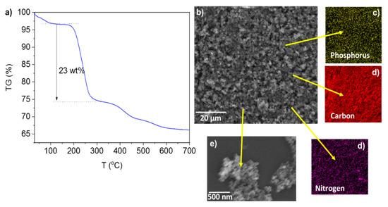 Thermal gravimetric analysis (TGA) was performed under O2 atmosphere with heat ramp of 5 °C/min in a Pt pan (Model of TGA: TA Q600, USA). According to obtained profile, there is a weight loss (~23 wt%) in thermal TG profile of SiO2/AA in air ranging from 200–300 °C (Figure 1a). Elemental SEM-mapping of SiO2/AA@YLIP2 was performed (model TE-SCAN, on 5 kV) to confirm the immobilization of lipase (LIP2) on the surface of SiO2/AA. Moreover, the high magnification SEM image of SiO2/AA@YLIP2 shows the morphology of the silica nanoparticles carrying lipase (Figure 1).