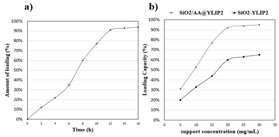 The final activity of the concentrated lipase powder in terms of PNPL hydrolysis as the substrate was obtained ~5000 U/g. Besides, the amount of YLIP2 immobilization on SiO2/AA was found: ~4600 U/g. By comparing the activity of the immobilized lipase and free lipase per g of catalyst, the activity of immobilized lipase was significantly maintained during the immobilization step. This observation shows that our proposed matrix and nanomaterial has high adaptability with extracted LIP2 and does not deactivate the active sites of the enzyme. Since our support has organocatalytic activity, as we have discussed before [34], we found that it (SiO2/AA) also exhibits a similar organocatalytic activity in the hydrolysis of PNPL (15% hydrolysis activity). Therefore, the support not only immobilizes the lipase but also has a co-catalytic effect on the hydrolysis of the PNPL. Aside from the organocatalytic activity of the support, the 92% of lipase’s activity (~4600 U/g) was retained after immobilization compared to the initial activity of the lipase (5000 U/g, free concentrated lipase activity). Since the pure silica surface is somehow capable of adsorbing lipase onto its unmodified surface thanks to the silanol-rich surface, the present silica nanoparticles in this project were nakedly tested in the immobilization of lipase. The results showed that this type of silica nanoparticles can partially immobilize lipase and its activity in the PNPL hydrolysis is around ~63%, which agrees with previous reports [20]. Loading capacity of the support was measured by monitoring the residual lipase in the supernatant of the immobilization dispersion using the Bradford method. As indicated in Figure 2, the first 10 h had the highest rate of immobilization and afterward, the rate of immobilization decreases to zero within 16 h (Figure 2a).
