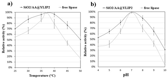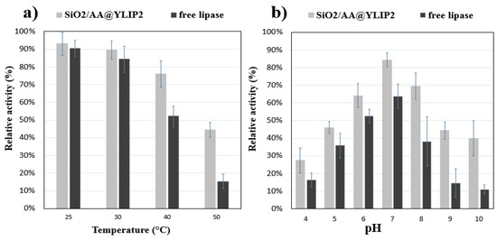 We examined the effect of temperature on the performance of both immobilized and free lipase and compared to those of normal and neutral conditions. The activity of SiO2/AA@YLIP2 in PNPL hydrolysis was monitored under the different temperatures (e.g., 25, 30, 40 and 50 °C) with reference to 37 °C (Figure 4a). Then, the effect of pH on the performance of immobilized lipase was monitored under different pHs (pH 4, 5, 6, 7, 8, and 9) and compared to the free lipase with reference to its neutral conditions (Figure 4b). The optimal pH for both free lipase and SiO2/AA@YLIP2 was found at pH = 7 while under acidic and alkaline conditions, the performance of the lipase in both conditions has a relative decrease.