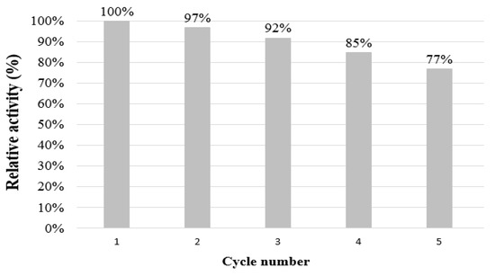 Activities of recovered SiO2/AA@YLIP2 for five consecutive cycles (100% activity = 4600 U/g).