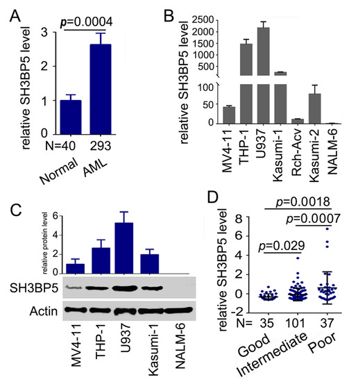 Elevated expression of SH3BP5 in acute myeloid leukemia (AML) cells and patients. (A) Relative expression of SH3BP5 mRNA in human normal and acute myeloid leukemia samples (GSE6236, GSE1010, and GSE1159). (B) SH3BP5 mRNA expression as determined by RT-PCR in human AML and B-ALL cell lines. Fold changes of SH3BP5 to that in ANLM-6 cells were plotted. N = 3. (C) Expression of SH3BP5 in AML cell lines was analyzed by western blot. Densitometric analysis of SH3BP5 normalized to actin was presented as a fold change compared with the value in MV4-11 cells. N = 3. (D) mRNA levels of SH3BP5 in human AML patients with good, intermediate, and poor karyotype.