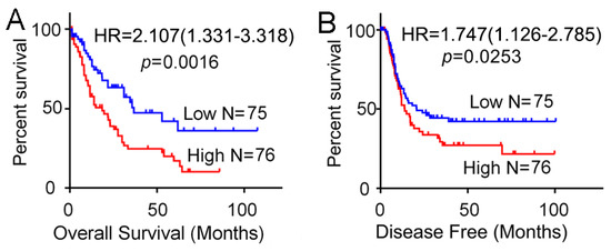 Elevated expression of SH3BP5 inversely correlated with survival of AML patients. (A) Overall and (B) disease-free survival of AML patients relative to SH3BP5 mRNA was determined by Kaplan–Meier analysis. Patients were divided into two groups based on expression levels of SH3BP5 above or below the 50th percentile. (A-B, data from the TCGA AML database).