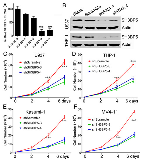 Knockdown of SH3BP5 expression suppresses growth of U937 and THP-1 cells. (A) U937 cells were infected with SH3BP5 or scramble shRNA for 24 h followed by RT-PCR analysis transcription of SH3BP5. N = 5, **, p < 0.01 compared to scramble shRNA group. (B) U937 or THP-1 cells were infected with indicated shRNAs for 72 h followed by western blot analysis expression of SH3BP5. (C–F) Cell numbers of U937, THP-1, Kasumi-1, and MV4-11, at 2, 4, and 6 days post-infection, with indicated shRNA. N = 3, ***, p < 0.005 compared with the SH3BP5 shRNA groups.