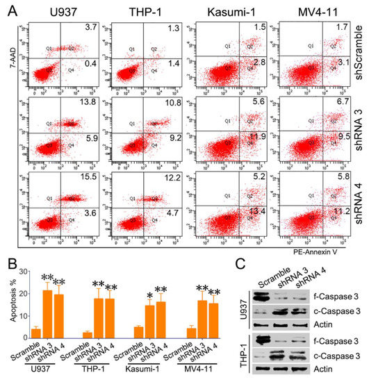Knockdown of SH3BP5 expression-induced apoptosis of AML cells. (A) U937, THP-1, Kasumi-1, and MV4-11 cells were infected with SH3BP5 or scramble shRNAs for 72 h, followed by analysis of cell apoptosis by 7-AAD and PE-Annexin V labeling. Shown are representative scatter plots of flow cytometry. (B) Shown is apoptosis rate of U937, THP-1, Kasumi-1, and MV4-11 cells. N = 3, *, p < 0.05 **, and p < 0.01 compared with the scramble shRNA group. (C) U937 and THP-1 cells were infected with SH3BP5 or scramble shRNAs for 72 h, followed by western blotting analysis of expression of Caspase 3 (f-Caspase 3, full-length Caspase 3; c-Caspase 3, cleaved-Caspase 3).