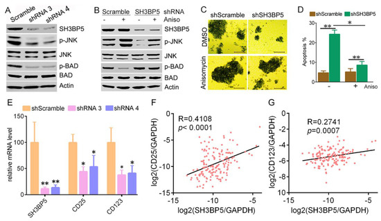 Previous studies have suggested that SH3BP5 physically interacts with JNK by its N-terminal SH3 domain binding site, and plays unique roles in JNK-mediated signal transduction [6,7,8,9]. We hypothesized that JNK-mediated signaling may be involved in function of SH3BP5 to promote AML cells survival. Herein, we found that knockdown of SH3BP5 expression by shRNAs decreased phosphorylation of JNK in THP-1 cells. Levels of p-BAD, which is a target of JNK, were also significantly decreased in SH3BP5 knockdown cells (Figure 6A). Consistently, levels of p-JNK and p-BAD were increased in THP-1 cells that were pre-treated with JNK agonist anisomycin (Figure 6B). These data imply that SH3BP5 promotes the activation of JNK-BAD signaling. To test whether JNK-BAD signaling is involved in the SH3BP3-promoted survival of AML cells, THP-1 cells were pre-treated with JNK agonist anisomycin, then infected with SH3BP5 shRNA. Results showed that anisomycin slightly induced cell growth in scrambled shRNA-treated cells. SH3BP5 knockdown significantly decreased growth of THP-1 cells. Interestingly, anisomycin rescued the inhibition of growth by SH3BP5 knockdown (Figure 6C). Moreover, anisomycin caused THP-1 cell apoptosis similar to levels of untreated cells, further indicating that activated JNK rescued the SH3BP5 deficiency (Figure 6D). Together, these data indicated that the oncogenic function of SH3BP5 may be mediated by the JNK-BAD signaling pathway. Leukemia stem cells play prominent roles in leukemogenesis and propagation due to their capacities of self-renewal, proliferation, and differentiation. Thus, the established markers of leukemia stem cells such as CD25 and CD123 were determined. The RT-PCR result showed that knockdown of SH3BP5 expression decreased transcription of CD25 and CD123 (Figure 6E). Conformably, Spearman’s rank tests showed that the mRNA expression of SH3BP5 was positively correlated with the mRNA expression of CD25 and CD123 in 151 AML patients (Figure 6F,G).