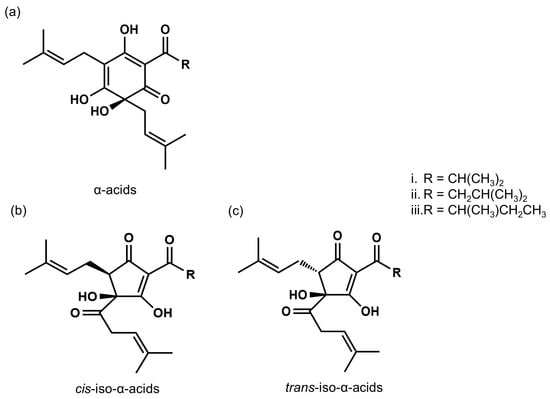 The chemical structures of α-acids and iso-α-acids. (a) α-acids; cohumulone (i), n-humulone (ii), and adhumulone (iii). (b) cis-iso-α-acids; cis-isocohumulone (i), cis-isohumulone (ii), and cis-isoadhumulone (iii). (c) trans-iso-α-acids; trans-isocohumulone (i), trans-isohumulone (ii), and trans-isoadhumulone (iii).