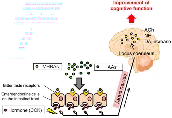 As mentioned above, IAAs are potent agonists for T2Rs, which are abundantly expressed in gastrointestinal enteroendocrine cells [,]. Bitter stimuli induce intracellular Ca2+ increases in enteroendocrine cells, which subsequently release cholecystokinin (CCK), a GI hormone that transmits signals via CCK receptors and stimulates vagus nerve activity []. The vagus nerve communicates visceral stimuli to the locus coeruleus (LC), which is located in the brain stem, and then to various brain regions including the hippocampus. Kempadoo et al. [] reported that DA release from the LC to the dorsal hippocampus improves hippocampus-dependent spatial memory. Takeuchi et al. [] reported that the dopaminergic neurons projecting from the LC to the hippocampus mediate episodic memory functions. Given this, the cognitive improvement effects of IAAs are thought to be mediated by the activation of T2Rs and consequent vagus nerve stimulation. Indeed, vagotomy operations attenuated the effect of IAAs on increasing DA content in the hippocampus and improved spatial and episodic memory functions. Taken together, these results indicate that IAAs may activate DA signaling via stimulation of the vagus nerve, which enhances hippocampus-dependent memory function.