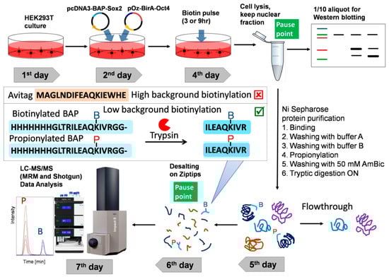 protein–protein interactions (PPI); proximity-utilizing biotinylation (PUB); biotin acceptor peptide (BAP); BirA; proteomics; liquid chromatography–tandem mass spectrometry (LC–MS/MS); multiple reaction monitoring (MRM); in vivo DNA-dependent protein–protein interaction; pluripotency transcription factors Sox2 and Oct4 1. Introduction