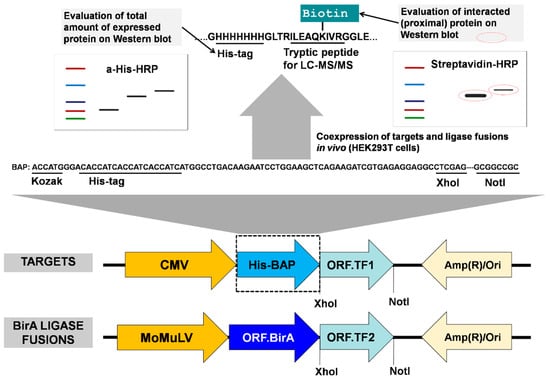 The principle of the method is the enzyme/substrate pair reaction [31,32,33], where two proteins to be tested for their proximity in vivo are coexpressed in cells (for example HEK293T or HeLa), one as fused to the enzyme BirA, and the other fused to aBAP. A more efficient biotinylation of the BAP is expected when the two proteins are in proximity to each other, for example, when an interaction occurs. The biotinylation status of the BAP fusion protein can be further monitored by Western blot or mass spectrometry. To implement this principle, we constructed two types of vectors, one for the expression of the BirA fusion protein, and the other for the expression of the BAP fusion protein, (Figure 2). All BirAfusion vectors contained the humanized version of the Escherichia coli biotin ligase [25]. Each vector was constructed in two forms, with protein expression regulated by either a strong cytomegalovirus (CMV) enhancer (plasmids based on pcDNA3.1(+)) or a weaker moloney murine leukemia virus (MoMuLV) (plasmids based on pOz) enhancer. In this work, the MoMuLV enhancer was used for the expression of BirA fusion proteins, while the BAP fusion proteins were expressed from vectors containing the stronger (CMV) promoter. This setting typically allowed us to achieve an excess of BAP fusion proteins (BAP-TF1 or biotinylation target) over BirA fusion proteins (BirA-TF2 or biotinylating enzyme), which was essential for further analysis.