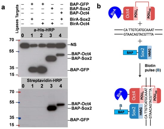 (a) Biotinylationis interaction/proximity-dependent (DNA-dependent binary interaction between Sox2 and Oct4). The positions of the BAPfusion proteins and nonspecific signal (NS) are indicated. Importantly, the NS was also detected in untransfected cells and corresponds to cellular proteins that bind to the anti-His antibodies. Expression of BAP-GFP was used as a control (since GFP does not have a DNA-binding domain). Western blot using anti-His-HRP shows the total expression levels of the recombinant proteins BAP-GFP, BAP-Sox2, and BAP-Oct4 (Top, lanes 1–4). Strong signals in the streptavidin-HRP Western blot identifyproteins which are in proximity in vivo (lanes 3, 4, Bottom). Biotin pulse, 30 min. (b) Since the high-mobility group (HMG) domain of BAP-Sox2 and the POU domain of BirA-Oct4 assemble on closely spaced composites of CATTGTC-like and ATGCAAAT-like DNA binding sites, the BAP target will be biotinylated. No biotinylation was observed when coexpressing BAP-GFP and BirA-Sox2 and BAP-GFP and BirA-Oct4 (lanes 1 and 2).
