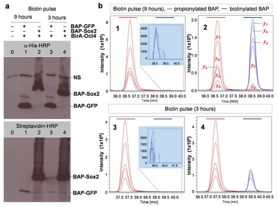 The biotinylation levels are interaction/proximity-dependent. (a) Western blotting to detect the interaction of pluripotency transcription factors versus a control at two biotin pulse times. Combinations of BirA and BAP fusion proteins were transfected separately into cells: lanes 1 and 3: BAP-GFP + BirA-Oct4 (control), lanes 2 and 4: BAP-Sox2 + BirA-Oct4, 0: nontransfected cells, NS: nonspecific signal. (b) Multiple reaction monitoring (MRM) detection of propionylated and biotinylated BAPs. Shown are extracted ions chromatograms for the most intensive fragmentation ions present in the MS/MS spectra of the respective peptides (y-series). Note the change of peaks corresponding to biotinylated BAP (colored blue) relative to propionylated BAP (colored brown) at different biotin pulse times (sample 2 and sample 4). Numbers in the graphs correspond to the lane numbers in the Western blots.