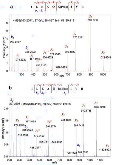 Propionylated and biotinylated BAP peptides (ILEAQK(propionyl)IVR and ILEAQK(biotinyl)IVR) can be unambiguously differentiated by MS/MS. (a) MS/MS spectrum of a propionylated BAP peptide. (b) MS/MS spectrum of a biotinylated BAP peptide.