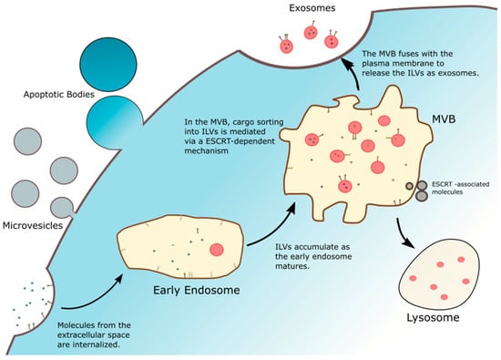 Membranous vesicles secreted by cells are collectively termed extracellular vesicles (EVs), of which there are three main subtypes: exosomes, microvesicles and apoptotic bodies []. These EVs are secreted by most cell types and are ubiquitous in all types of biological fluids, including blood, urine, amniotic fluid, saliva and cerebrospinal fluid [,]. Exosomes are the smallest type of EVs (50–150 nm) and, unlike the microvesicles and apoptotic bodies which are directly shed from the plasma membrane, exosomes are released following the fusion of late endosomes and multivesicular bodies with the plasma membrane []. Exosome release follows a highly dynamic endocytic pathway (Figure 1). The first step involves the accumulation of intraluminal vesicles (ILVs) as early endosomes mature into late endosomes. These ILVs sort and entrap proteins, lipids and cytosol within these late endosomes, leading to morphological changes that result in multivesicular bodies (MVBs) [,,]. Though in most cases, MVBs fuse with lysosomes for the degradation and recycling of their contents, certain MVBs are decorated with specific proteins and markers that instead ensures their fusion with the plasma membrane and allows the release of their content to the extracellular space and become known as exosomes. This sorting is facilitated by the endosomal sorting complex required for transport (ESCRT), a mechanism which involves about 30 different proteins that help sequester specific biomolecules in the MVBs and guide their release through the plasma membrane as exosomes [,,].