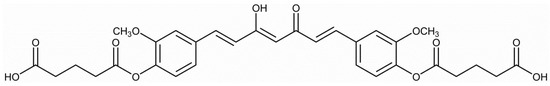 Curcumin diglutaric acid (CG) (Figure 1) is a prodrug of curcumin and is synthesized by conjugation of curcumin with glutaric acid via an ester linkage. It shows better antinociceptive and anticancer properties with higher water solubility compared to traditional curcumin [23]. However, CG degrades in an aqueous environment, especially in an alkaline pH, resulting in poor oral bioavailability [23]. One possibility to overcome this limitation is to incorporate CG in suitable drug carriers, like SPIONs stabilized with PEG-CSO.