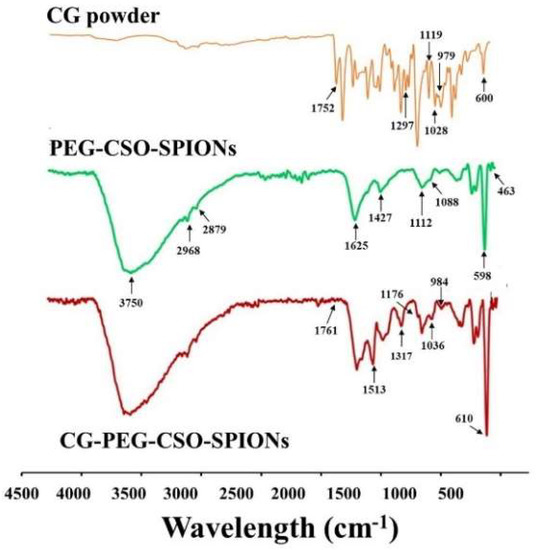 The overlay FT-IR spectra of the CG powder, PEG-CSO-SPIONs and CDG-PEG-CSO-SPIONs are shown in Figure 5. The spectrum of the CG powder showed its characteristic peaks at 1752 cm−1 (C=O stretching vibration of carboxylate ester), 1508 cm−1 (C=C vibrations), 1297 cm−1 (C-O stretching of carboxylic acid), 1119 cm−1 (aromatic C-C-H bending), 1028 cm−1 (symmetrical and asymmetrical C-O-C stretching vibration), 979 cm−1 (benzoate trans-CH vibration), and 600 cm−1 (cis-CH vibration of an aromatic ring). In the case of the PEG-CSO-SPIONs and SPIONs, they showed only two characteristic peaks at 598 cm−1 and 463 cm−1 (Fe-O vibration). However, the characteristic PEG peaks at 2879 cm−1 (C-H stretching of alkanes) and 1112 cm−1 (C-O-C of ether) and the characteristic CSO peaks at 3750 cm−1 (OH stretching vibration), 2968 cm−1 (C-H stretching), 1625 cm−1 (Amide I), and 1088 cm−1 (C=O), were also observed in the spectrum of PEG-CSO-SPIONs indicating the coating of PEG and CSO on the surface of the SPIONs. In addition, most of characteristic peaks of CG were found in the spectrum of the CG-PEG-CSO-SPIONs, confirming the physical interaction of CG with the NP matrix and also suggesting that the CG structure and its integrity were not affected by PEG-CSO-SPIONs.