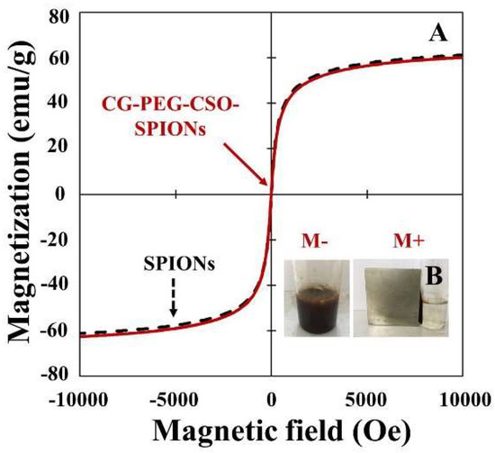 Representative VSM analysis showing the magnetic behavior of (A) SPIONs and CG-PEG-CSO-SPIONs and (B) the localization of CG-PEG-CSO-SPIONs near an external magnet. (M−) Without magnet; (M+) with magnet.