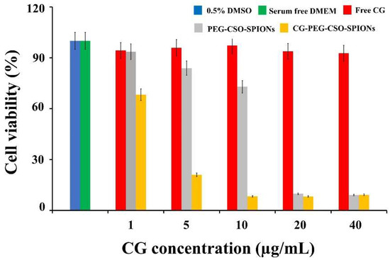 HT-29 cell viability after treatment with control (PEG-CSO-SPIONs), free CG, and CG-PEG-CSO-SPIONs for 24 h. Data are shown as the mean ± SD, derived from four trials.