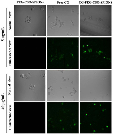 Enhanced cellular internalization or cellular uptake of drug loaded-NPs in cancer cells is typically an indication of a higher therapeutic index [29]. Thus, the present study determined the qualitative uptake of CG-PEG-CSO-SPIONs by HT-29 cells. Since the chemical structure of CG contains a fluorophore with maximum excitation and emission wavelengths of 400 and 470 nm, respectively, fluorescent dye staining is not required for visualization of the cellular uptake of free CG or CG-PEG-CSO-SPIONs. Rather, CLSM images can represent the cellular uptake of free CG and CG-PEG-CSO-SPIONs, and those at two different CG concentrations (5 ug/mL and 40 ug/mL) are shown in Figure 12. The cellular uptake of CG and CG-loaded nanoparticles was determined based on the fluorophore of CG using CLSM. The blank nanoparticles were used as a control and no fluorescent signal was observed. However, the fluorescent signals were observed for the cellular uptake of CG and CG-loaded nanoparticles, suggesting the cellular internalization of CG and CG-loaded NPs. The higher intensity of the CG-loaded nanoparticles comparing to free CG suggests that the nanoparticles can enhance the cellular uptake of CG. The green fluorescence intensity in the HT-29 cells treated with free CG or CG-PEG-CSO-SPIONs increased as the loaded CG concentration increased from 5 ug/mL to 40 ug/mL, whereas the blank NPs did not give any fluorescent signal. Thus, the cellular uptake of free CG and CG-PEG-CSO-SPIONs by HT-29 cells was concentration-dependent. The CLSM images indicated that a higher cellular uptake (higher green fluorescent intensity) of CG in cells treated with CG-PEG-CSO-SPIONs than with free CG at both tested CG concentrations. This reflects that the CG-loaded NPs were more easily taken up by cells via endocytosis, due to their smaller size (~130 nm), while the hydrophobic character of free CG leads to the formation of large insoluble aggregates in aqueous solutions that are more difficult to be uptaken (endocytosis) by cells [38,39].