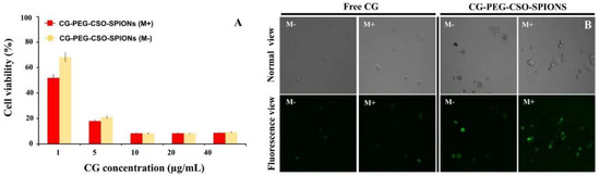 Magnetic targeting delivery analyzed in terms of the (A) HT-29 cell viability using the MTT assay (data are shown as the mean ± SD, derived from 3 trials) and (B) representative CLSM images of HT-29 cells after incubation with free CG or CG-PEG-CSO-SPIONs at 40 µg CG/mL for 24 h with (M+) or without (M−) an external magnetic field.