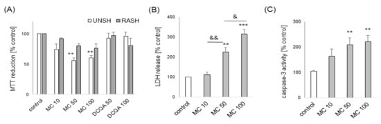 (A) The effect of MC (10–100 μM) or 3,5-DCQA (50 and 100 μM) on cell viability of undifferentiated (UN-) and retinoic acid-differentiated (RA-) SH-SY5Y cells after 24 h of treatment (measured with MTT reduction assay). (B) The cytotoxic effect of MC (10–100 μM) in UN-SH-SY5Y cells after 24 h of treatment as measured with LDH release assay. (C) The effect of MC (10–100 μM) on caspase-3 activity in UN-SH-SY5Y cells after 9 h of treatment. Data were normalized to vehicle-treated cells and are presented as the mean ± SEM. *** p < 0.001 and ** p < 0.01 vs. vehicle-treated cells; && p < 0.01 and & p < 0.05 a higher vs. lower concentration of MC.