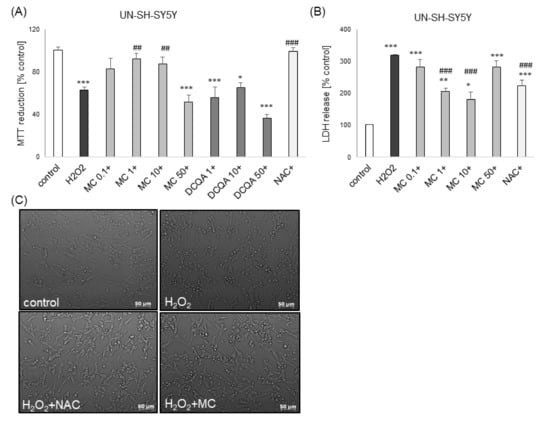 The protective effects of methyl caffeate (MC) against hydrogen peroxide (H2O2)-evoked UN-SH-SY5Y cell damage. (A,B) Cell viability (A) and toxicity (B) in UN-SH-SY5Y cells pre-treated for 30 min. with MC (0.1-50 μM) or 3,5-DCQA (1-50 μM) or co-treated with N-acetylcysteine (NAC, 1 mM) followed by 24 of treatment with H2O2 (0.25 mM) measured by MTT reduction and LDH release assays, respectively. Data were normalized to the vehicle-treated cells and are presented as the mean ± SEM. *** p < 0.001, ** p < 0.01 and * p < 0.05 vs. vehicle-treated cells; ### p < 0.001 and ## p < 0.01 vs. H2O2-treated cells. (C) Representative DIC (differential interference contrast) images of UN-SH-SY5Y cells treated for 24 h with MC (10 μM) or N-acetylcysteine (1 mM) and H2O2 (0.25 mM).