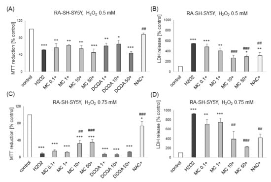 The protective effects of MC against hydrogen peroxide (H2O2)-evoked RA-SH-SY5Y cell damage. (A,C) Cell viability of RA-SH-SY5Y cells pre-treated for 30 min. with MC (0.1–50 μM) or 3,5-DCQA (1–50 μM) or co-treated with N-acetylcysteine (NAC, 1 mM) followed by 24 of treatment with 0.5 mM (A) or 0.75 mM (C) H2O2 measured by MTT reduction assay. (B,D) Cell toxicity of RA-SH-SY5Y cells pre-treated for 30 min. with MC (0.1–50 μM) or co-treated with N-acetylcysteine (NAC, 1 mM) followed by 24 h of treatment with H2O2 with 0.5 mM (A) or 0.75 mM (C) H2O2 as measured by LDH release assay. Data were normalized to the vehicle-treated cells and are presented as the mean ± SEM. *** p < 0.001, ** p < 0.01, and * p < 0.05 vs. vehicle-treated cells; ### p < 0.001 and ## p < 0.01 vs. H2O2-treated cells.