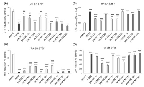 The protective effects of MC against hydrogen peroxide (H2O2)-evoked UN- or RA-SH-SY5Y cell damage are retained under pre- and co-treatment but not in post-treatment conditions. (A,C) Cell viability of UN-(A) and RA-(C) SH-SY5Y cells pre-treated (30 min. before H2O2), co-treated and post-treated (30 min. after H2O2) with MC (1–50 μM) followed by 24 of treatment with H2O2 (0.25 and 0.5 mM for UN- and RA-SH-SY5Y cells, respectively) as measured by MTT reduction assay. (B,D) Cell toxicity in UN-(B) and RA-(D) SH-SY5Y cells pre-treated, co- and post-treated with MC (1–50 μM) followed by 24 of treatment with H2O2 (0.25 and 0.5 mM for UN- and RA-SH-SY5Y cells, respectively) as measured by LDH release assay. Data were normalized to the vehicle-treated cells and are presented as the mean ± SEM. *** p < 0.001, ** p < 0.01 and * p < 0.05 vs. vehicle-treated cells; ### p < 0.001, ## p < 0.01 and # p < 0.05 and vs. H2O2-treated cells.