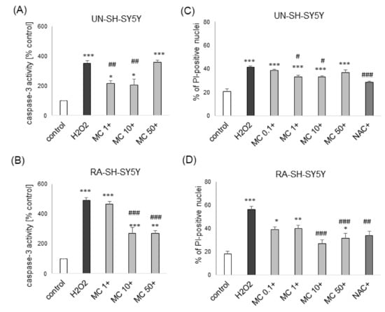 The protective effects of MC against hydrogen peroxide (H2O2)-evoked UN- or RA-SH-SY5Y cell damage are mediated by inhibition of apoptotic and necrotic processes. (A,B) The effect of 30-min pre-treatment with MC (1–50 μM) followed by 9 h of exposure to H2O2 (0.25 and 0.75 mM for UN- and RA-SH-SY5Y cells, respectively) on caspase-3 activity in UN-(A) and RA-(B) SH-SY5Y cells. Data were normalized to vehicle-treated cells and are presented as the mean ± SEM. (C,D) The effect of 30-min pre-treatment with MC (0.1–50 μM) or co-treated with N-acetylcysteine (NAC, 1 mM) followed by 24 h of exposure to H2O2 (0.25 and 0.75 mM for UN- and RA-SH-SY5Y cells, respectively) on the number of necrotic nuclei measured by propidium ioide (PI) staining and flow cytometry in UN-(C) and RA-(D) SH-SY5Y cells. Data are presented as the mean ± SEM percentage of necrotic nuclei. *** p < 0.001, ** p < 0.01 and * p < 0.05 vs. vehicle-treated cells; ### p < 0.001, ## p < 0.01 and # p < 0.05 vs. H2O2 -treated cells.