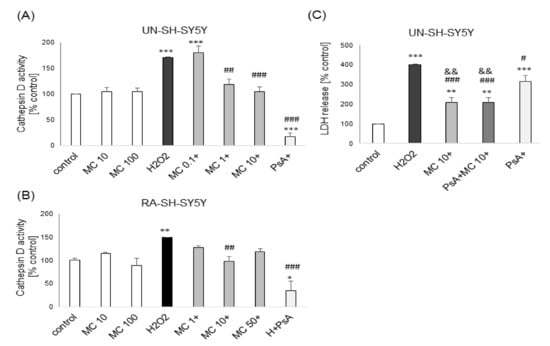 In the present study, we observed an increase in cathepsin D activity after 18 h of exposure of UN- and RA-SH-SY5Y cells to H2O2 which confirms our previous results [41,42]. This effect was significantly attenuated by MC (1–10 and 10 μM for UN- and RA-SH-SY5Y cells, respectively) and cathepsin D inhibitor, PsA (0.3 μM) (Figure 7A,B). Additionally, by using cytotoxicity (LDH release) assay we demonstrated that protection mediated by MC was significantly higher than PsA-mediated but was not changed after combined treatment with both neuroprotective compounds (Figure 7C).