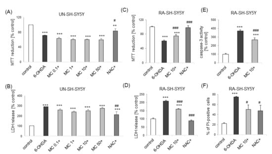 Next, we tested the effect of pre-treatment with MC against SH-SY5Y cell damage induced by dopaminergic neurotoxin, 6-OHDA in UN- and RA-SH-SY5Y cells. We observed protection afforded by NAC (1 mM) but not by MC (0.1-50 μM) against 6-OHDA (100 μM)-induced cell damage in UN-SH-SY5Y cells (Figure 8A,B). On the contrary, we found that MC (10 μM) partially attenuated the cell damage induced by 6-OHDA (200 μM) in RA-SH-SY5Y cells as confirmed by cell viability test (Figure 8C) and LDH release assay (Figure 8D). Moreover, this protection was connected with attenuation of apoptotic (caspase-3 activity; Figure 8E) and necrotic (PI-positive cells; Figure 8F) processes.