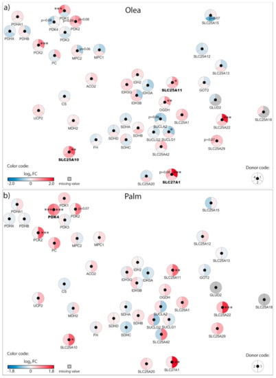 Effects of oleate (Olea) and palmitate (Palm) on the transcriptional regulation of mitochondrial solute carriers and associated genes: pyruvate metabolism, TCA cycle enzymes, amino acid metabolism and fatty acid transport. Human islets were exposed to 0.4 mM (a) Olea or (b) Palm at standard glucose concentration (G5.5) for 3 days before RNA-Seq analysis. Effects of lipotoxic culture conditions on transcript levels are compared to standard G5.5 medium and shown as upregulated (red), downregulated (blue), or unchanged (white). Missing values are represented in grey. Each disk is split into individual changes for the different islet donors. Color code reflects the transcriptional changes in log2 fold changes (log2 FC) for that particular gene in individual donors. Clinical data from individual donors are shown in Supplementary Table S1, while quantitative transcriptional data are shown in Supplementary Table S2. * adjusted p < 0.05, ** adjusted p < 0.01, *** adjusted p < 0.001 between control 5.5 mM glucose and the specific culture condition.