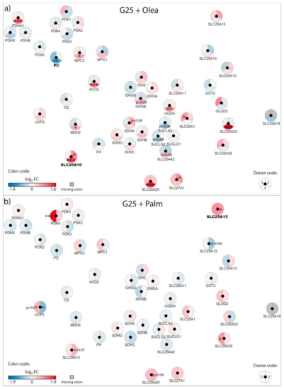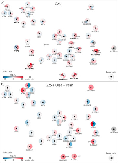 Effects of high 25 mM glucose (G25) plus 0.4 mM oleate (G25 + Olea) or palmitate (G25 + Palm) on the transcriptional regulation of mitochondrial solute carriers and associated genes. Human islets were exposed to (a) G25 + Olea or (b) G25 + Palm glucolipotoxic conditions for 3 days before RNA-Seq analysis. Effects of culture conditions on transcript levels are compared to standard G5.5 medium and shown as upregulated (red), downregulated (blue), or unchanged (white). Missing values are represented in grey. Each disk is split into individual changes for the different donors. Color code reflects the transcriptional changes in log2 fold changes (log2 FC) for that particular gene in individual donors. Clinical data from individual donors are shown in Supplementary Table S1, while quantitative transcriptional data are shown in Supplementary Table S2. * adjusted p < 0.05, ** adjusted p < 0.01, *** adjusted p < 0.001 between control 5.5 mM glucose and the specific culture condition.