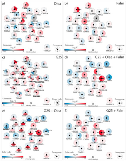 Effects of high 25 mM glucose (G25) and 0.4 mM oleate (Olea) or palmitate (Palm) on the transcriptional regulation of the outer and inner mitochondrial membrane translocases TOM/TIM. Human islets were exposed to (a) Olea at G5.5, (b) Palm at G5.5, (c) G25, (d) G25 + Olea + Palm, (e) G25 + Olea, and (f) G25 + Palm for 3 days before RNA-Seq analysis. Effects of culture conditions on transcript levels are compared to standard G5.5 medium and shown as upregulated (red), downregulated (blue), or unchanged (white). Missing values are represented in grey. Each disk is split into individual changes for the different donors. Color code reflects the transcriptional changes in log2 fold changes (log2 FC) for that particular gene in individual donors. * adjusted p < 0.05, ** adjusted p < 0.01, *** adjusted p < 0.001 between control 5.5 mM glucose and the specific culture condition.