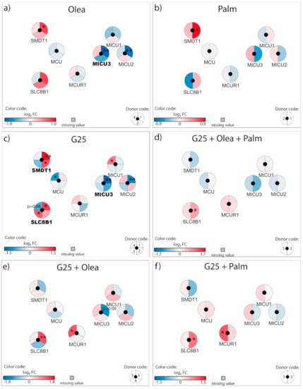 Effects of high 25 mM glucose (G25) and 0.4 mM oleate (Olea) or palmitate (Palm) on the transcriptional regulation of mitochondrial calcium transport genes. Human islets were exposed to (a) Olea at G5.5, (b) Palm at G5.5, (c) G25, (d) G25 + Olea + Palm, (e) G25 + Olea, and (f) G25 + Palm for 3 days before RNA-Seq analysis. Effects of culture conditions on transcript levels are compared to standard G5.5 medium and shown as upregulated (red), downregulated (blue), or unchanged (white). Missing values are represented in grey. Each disk is split into individual changes for the different donors. Color code reflects the transcriptional changes in log2 fold changes (log2 FC) for that particular gene in individual donors. * adjusted p < 0.05, ** adjusted p < 0.01 between control 5.5 mM glucose and the specific culture condition.