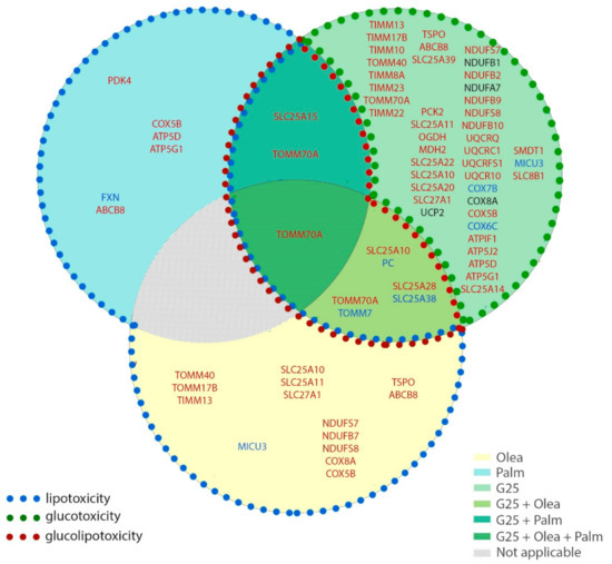 Stress-specific mitochondrial transcriptome profile of human islets upon lipotoxic, glucotoxic, and glucolipotoxic conditions. Isolated human islets were exposed for 3 days to different culture conditions: 25 mM glucose (G25) in the green circle, 0.4 mM oleate (Olea) in the yellow circle, and 0.4 mM palmitate (Palm) in the blue circle. The superimposition of the circles represents the mix of the corresponding conditions: G25 + Olea in the superimposition of the green and yellow circles, G25 + Palm in the superimposition of the green and blue circles, and G25 + Palm + Olea in the superimposition of the three conditions. The condition corresponding to Palm + Olea at G5.5 was not tested (not applicable). The circle sections contain the genes whose expression is modified upon that specific stress condition. Colors reflect positive (red), negative (blue) or variable (black) changes in mRNA. Significant changes were considered when two or more independent islet batches (donors) exhibited down or upregulation with a log2 FC threshold of 0.5 associated with one or more adjusted p < 0.05.