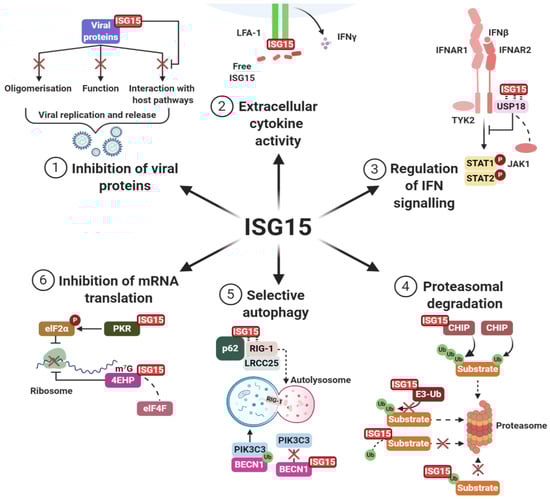 - Perng, Y.C.; Lenschow, D.J. ISG15 in antiviral immunity and beyond. Nat. Rev. Microbiol. 2018, 16, 423–439. [Google Scholar] [CrossRef]