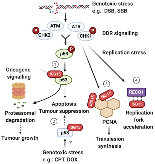 Key aspects of the DNA damage response (DDR) and associated pathways regulated by ISG15. Following exposure to genotoxic stress, DDR signalling is initiated via the activation of apical DDR kinases including ATM and ATR and their targets CHK2 and CHK1, respectively, which in turn activate downstream pathways, such as p53-mediated apoptosis and tumour suppression, or processes that facilitate DNA replication past lesions including translesion DNA synthesis and regulation of replication fork progression. ISG15 intersects with these pathways at multiple points: (1) DNA damage-induced activation of p53 induces the expression of the ISG15 system. ISGylation of p53 in multiple positions can target p53 for proteasomal degradation to promote tumour growth, or, alternatively, mediate cell-cycle arrest, apoptotic responses and ultimately tumour suppression depending on the exact circumstances. ISGylation of p53 has also been linked to oncogene-mediated transformation by targeting p53 for degradation via the 20S proteasome. (2) In order to prevent tumourigenesis, genotoxic stress caused by chemotherapeutic drugs can stimulate ISGylation of p63 isoforms independently of p53 through yet not fully understood mechanisms. In addition, ISGylation of PCNA (3) and non-covalent interaction of ISG15 with RECQ1 (4) function in translesion DNA synthesis and replication fork acceleration, respectively, in cells undergoing replicative stress. CPT: camptothecin; DOX: doxorubicin; DSBs: DNA double-strand breaks; SSBs: DNA single-strand breaks; P: phosphorylation. Figure created using BioRender.com (2020).