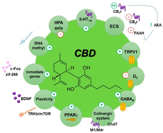 Schematic representation of the main hypothesized mechanisms described for the anxiolytic, antidepressant and antipsychotic actions of CBD. AEA: anandamide; 5-HT1A: serotonin receptor 1A; BDNF: brain delivered neurotrophic factor; CB1r: cannabinoid CB1 receptor; CB2r: cannabinoid CB2 receptor; ChAT: choline acetyltransferase; D2: dopamine receptor D2; DNA methyl: DNA methylation; ECS: endocannabinoid system; FAAH: fatty acid amide hydrolase; HPA axis: hypothalamus pituitary-axis; M1/M4r: muscarinic receptor 1 and 4; PPARγ: peroxisome proliferator activated receptor gamma; TRKb/mTOR: tropomyosin-receptor-kinase B/mammalian target of rapamycin; TRPV1: transient receptor potential cation channel subfamily V member 1.