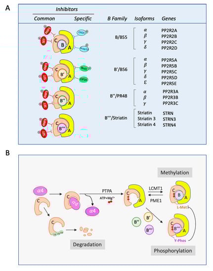 The regulatory subunit or B subunit includes four different families: B (B55/PR55), B’ (B56/PR61), B’’ (PR48/PR72/PR130), and B’’’ (PR93/PR110/Striatins). There is a low sequence similarity between the four families, and each of them can display several isoforms (Figure 1A).