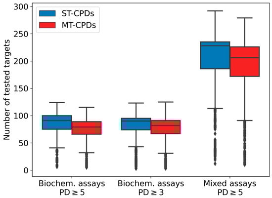 Prior to balancing of these datasets for ML calculations, we examined the test frequencies of the sampled compounds. The distributions are shown in Figure 1. MT- and ST-CPDs from biochemical assays had comparable test frequencies for both PD thresholds with a median value of ~90 assays per compound. Median test frequency values were slightly higher for ST-CPDs (91 for PD ≥ 5 and 90 for PD ≥ 3) than for MT-CPDs (79 for PD ≥ 5 and 82 for PD ≥ 3). Compounds from mixed assays were evaluated in even larger number of assays, with a median test frequency of 228 and 206 assays per ST- and MT-CPD, respectively. Hence, selected compounds were extensively tested, with comparably large numbers of assays for ST- and MT-CPDs. Accordingly, these datasets provided a sound basis for sampling of compounds to balance training and test sets for ML analysis.