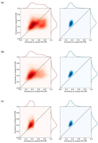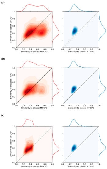 Figure 2 shows the distribution of closest Tanimoto similarity values for MT- and ST-CPD from biochemical assays in original and reduced datasets. The distribution for the original dataset in Figure 2a reveals a general tendency for MT-CPDs to be more similar to another MT-CPD than to ST-CPDs. For ST-CPDs, a similar but weaker tendency was detected because the densely populated part of the distribution mapped closely to the diagonal in the plot. Random compound removal did not notably change the NN similarity value distributions, as shown in Figure 2b. Accordingly, there was no significant effect of random compound removal on the distribution of NN relationships. By contrast, as shown in Figure 2c, equally sized removal of NN instances substantially altered the distribution for MT-CPDs (but not ST-CPDs) such that the densely populated part of the distribution mapped to the diagonal. In addition, many MT-CPDs became most similar to an ST-CPD after removal of their original NNs, which were predominantly MT-CPDs. Equivalent observations were made for MT- and ST-CPDs from mixed assays, as shown in Figure 3a for the original dataset and in Figure 3b,c for the reduced datasets following random compound or NN removal, respectively.