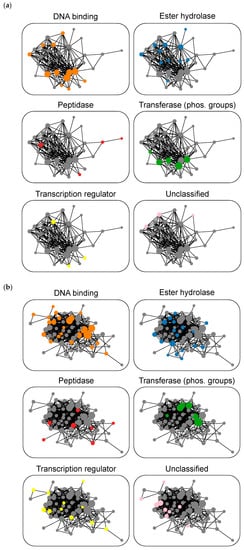 Target networks for multi-target compounds. In (a,b), networks are shown for MT-CPDs from biochemical and mixed assays, respectively. Each node represents an individual target that is scaled in size according to the number of its MT-CPDs. Nodes are connected by edges if the corresponding targets share at least 50 MT-CPDs. Since a target may have multiple functional annotations, all panels display the same target network colored according to the absence (gray) or presence of a given protein function (orange, DNA binding; blue, ester hydrolase; red, peptidase; green, phosphorous group transferase; yellow, transcription regulator; pink, unclassified).