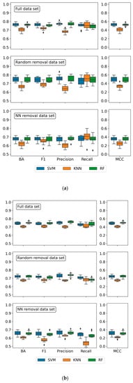 Comparison of prediction accuracies. In (a,b), prediction accuracies are shown for data sets from biochemical and mixed assays, respectively. Box plots report the distribution of balanced accuracy values for 10 independent SVM (blue), KNN (orange), and RF (green) trials using different training and test sets. From the top to the bottom, results are shown for all ST- and MT-CPDs (All CPDs), reduced data sets after random removal of 50% of the compounds (Random removal), and corresponding data sets after removal of 50% of NNs (NN removal).