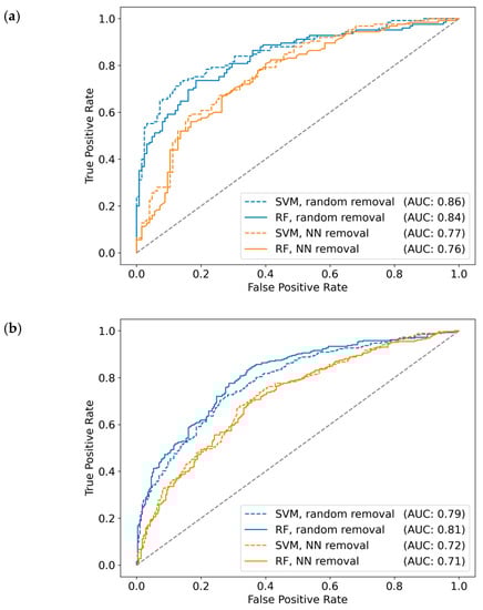 Receiver operating characteristic curves. For SVM and RF classification of ST- vs. MT-CPDs with random compound or NN removal, ROC curves report prediction results for the first compound data split. In (a,b), results are shown for data sets from biochemical and mixed assays, respectively.3.9. Predictions for Compounds from Mixed Assays