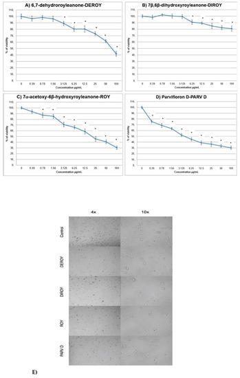 MTT assay was employed to measure the viability of primary H7PX glioma cells treated with different concentrations of abietane diterpenes, Deroy, Diroy, Roy, and Parv D. Briefly, cells were seeded at 1 × 104 cells per well in 96-well culture plates and left overnight. In the next step, the cells were incubated for 24 h with the test compounds over a range of concentrations: 0 (control), 0.39, 0.78, 1.56, 3.13, 6.25, 12.5, 25, 50, and 100 µg/mL. Following this, the cells were incubated with 0.5 mg/mL of 3-(4,5-dimethylthiazol-2-yl)-2,5-diphenyl tetrazolium bromide (MTT) at 37 °C for 1.5 h. After this time, MTT was carefully removed and DMSO (100 μL) was added to each well; the mixture was mixed at low speed for 5 min to fully dissolve the formazan crystals. Absorbance was measured at 570 nm with a reference at 630 nm using a Bio-Tek Synergy HT Microplate Reader (Bio-Tek Instruments, Winooski, VT, USA). All experiments were repeated in triplicate. Cell viability was expressed as a percentage relative to the untreated cells, which was defined as 100%. Cell line pictures after treatment were captured using HDCE-X5 digital microscope camera and Scopelmage9.0 software.