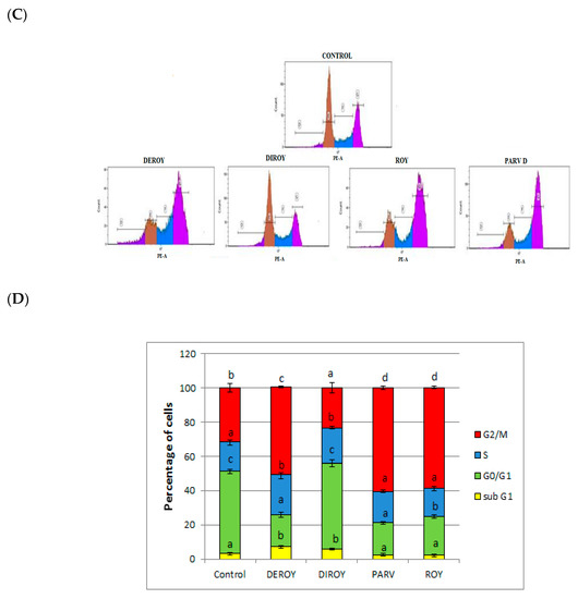 Flow cytometry analysis was performed to verify whether the tested compounds induced apoptosis or necrosis and whether they resulted in an altered cell cycle distribution. The experiment showed that cell death after treatment occurred mainly through the apoptosis pathway. A greater percentage of early and late apoptosis was observed after treatment with Deroy, Diroy, Roy, and Parv D) (62%, 20%, 53%, and 73%, respectively) compared to untreated cells. Cell cycle distribution analysis revealed increased H7PX cell percentage in G2/M phase after treatment with Deroy, Diroy, Roy, and Parv D compared to the untreated cells, with the respective percentages being 51%, 23%, 58%, and 60% (Figure 3A–D).