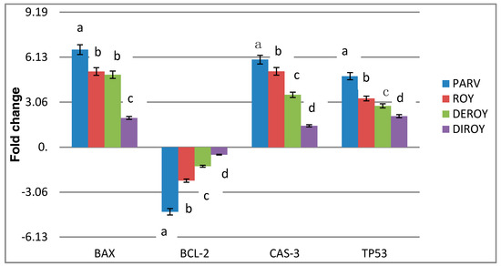 The effect of Deroy, Diroy, Roy, and Parv D treatment at IC50 on gene expression was also analyzed. Following 24-h treatment, the mRNA expression of TP53, Bax, and Cas-3 was found to be significantly increased in the cells treated with all tested compounds, while that of Bcl-2 was decreased (Figure 5).