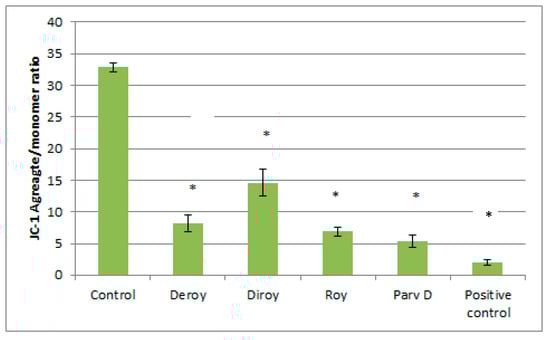 The mitochondrial membrane potential was measured by staining with JC-1 after treatment with IC50 for each of the pure compounds (Deroy, Diroy, Roy, and Parv D), to evaluate the functional status of mitochondria. After 24 h exposure, mitochondrial membrane potential was significantly decreased in primary H7AX glioma cells after treatment with all compounds compared to the control (Figure 6). Our data suggest that mitochondrial dependent mechanism contributed to abietane diterpenes (Deroy, Diroy, Roy, and Parv D) mediated apoptosis in primary H7AX glioma cells by mitochondrial membrane depolarization.