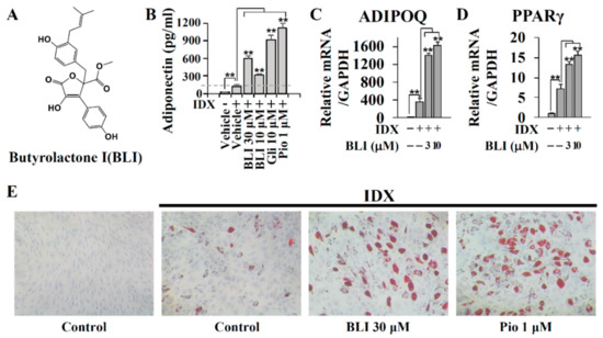 The adiponectin production-enhancing activity of butyrolactone I (BLI) during adipogenesis in human bone marrow-derived mesenchymal stem cells (hBM-MSCs). (A) The structure of butyrolactone I isolated from the marine-derived Aspergillus terreus. (B) Butyrolactone I was co-treated with the insulin (IDX) medium to induce adipogenesis in hBM-MSCs. On the fifth day of the adipogenic differentiation, cell culture supernatants were collected and the adiponectin production-enhancing activity was measured by ELISA. Glibenclamide (gli) and pioglitazone (pio) were used as positive controls. (C and D) In addition, on day 3, the total RNA was extracted and Q-RT-PCR was performed for adiponectin (ADIPOQ) and PPARγ. GAPDH was used as a reference control. (E) On the seventh day of adipogenic differentiation, ORO staining was performed to evaluate the lipid droplets formation. Values represent means ± standard deviation (SD, n = 3); * p ≤ 0.05, ** p ≤ 0.01.